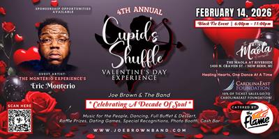 Enjoy a full buffet and dessert (catered by The Flame Catering & Banquet Center), dating games (singles and couples), romantic raffle prizes (self-love baskets, date nights, restaurants, spas, etc.), special recognitions (Best Single Male, Best Single Female, Best Couple, Best Dressed), beats by Dj L. Real, and the musical stylings of Joe Brown & The Band (10-piece)! Cupid's Shuffle is curated with both couples and singles in mind. So, whether you're in love, looking for love, or loving yourself, this is the experience for you!!